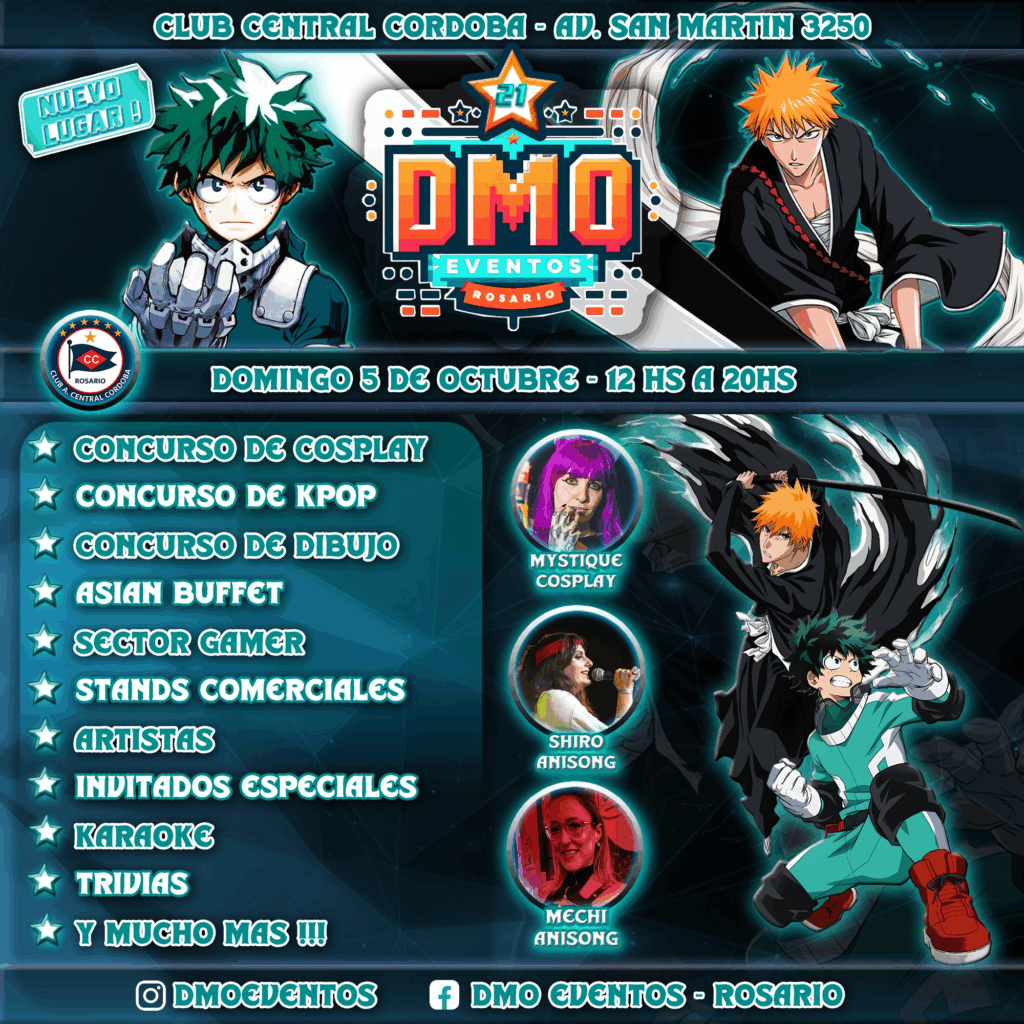 DMO Eventos Rosario, uno de los encuentros más importantes para la comunidad otaku y gamer de la ciudad, confirmó su 21ª edición. El evento se llevará a cabo este domingo 5 de octubre, en horario de 12:00 a 20:00 horas. La novedad es el cambio de locación: la convención se realizará en el Club Central Córdoba, ubicado en Avenida San Martín 3250, Rosario; a diferencia de todas sus otras ediciones, las cuales solían alojarse en los galpones frente al rio.